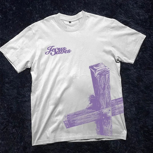 Jesus Saves Cross Print Graphic 100% Cotton T-Shirt Men Y2K Summer Short Sleeves Vintage Oversize...